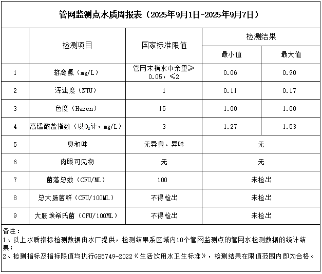 管網(wǎng)監(jiān)測(cè)點(diǎn)水質(zhì)周報(bào)表(2025年9月1日-2025年9月7日)