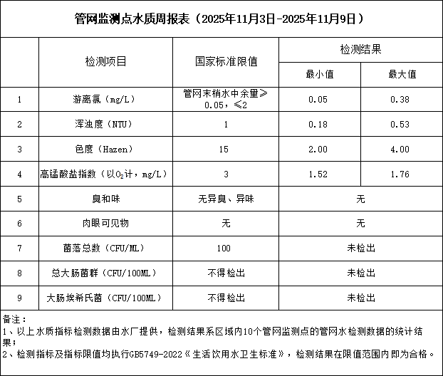 管網監測點水質周報表(2025年11月3日-2025年11月9日)