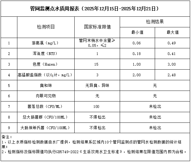 管網監測點水質周報表(2025年12月15日-2025年12月21日)