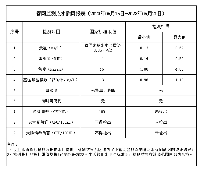 管網監測點水質周報表(2023年05月15日-2023年05月21日)