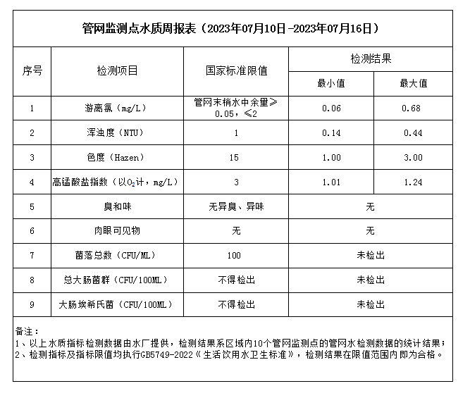管網(wǎng)監(jiān)測點(diǎn)水質(zhì)周報表(2023年07月10日-2023年07月16日)