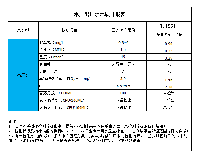 水廠出廠水水質日報表(2023-7-25)