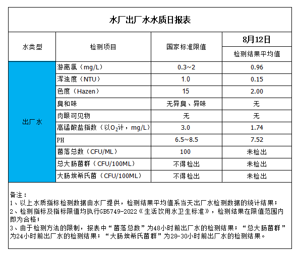 水廠出廠水水質日報表(2023-8-12)