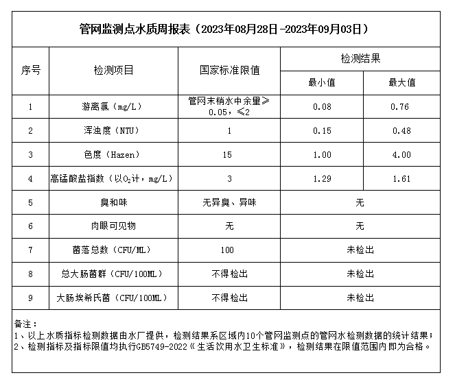 管網監測點水質周報表(2023年08月28日-2023年09月03日)