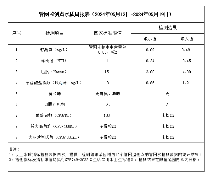 管網監測點水質周報表(2024年05月13日-2024年05月19日)