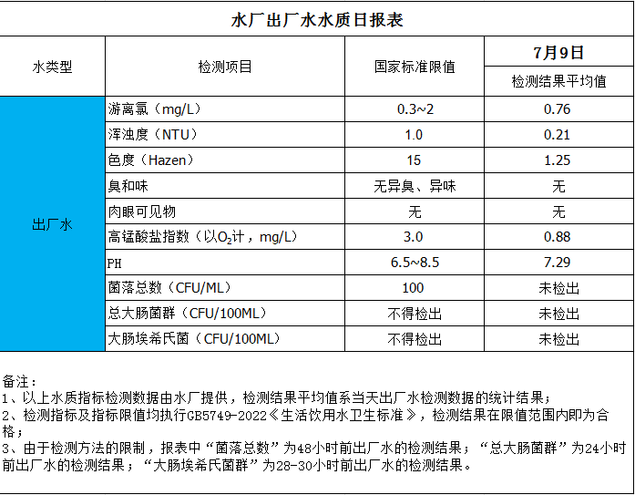 水廠出廠水水質(zhì)日報表(2024-7-9)
