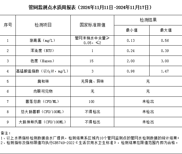 管網(wǎng)監(jiān)測點水質周報表(2024年11月11日-2024年11月17日)